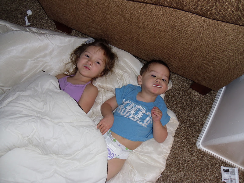 I am just in love with our two little munchkins. They are just so much fun and they make everyday an adventure and more exciting. The other day, I washed our bedspread and laid it on the floor after taking it out of the dryer. Well, Vanessa and Owen soon found themselves wrapped up in it. It was sure cute watching them have so much fun with a blanket.