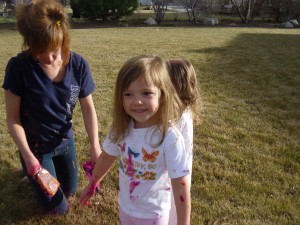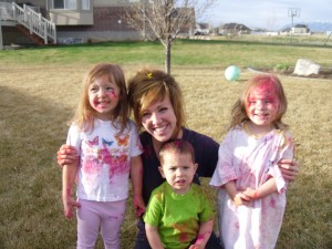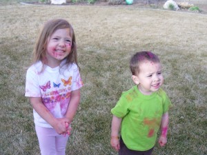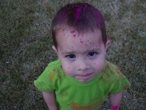 Aunt Kimberly is always bring fun stuff home to do with the kids. This most recent time, she surprised the kids with a super fun activity. She brought some powder chalk from the chalk festival and let the kids throw it. They had a blast and got very, very colorful! This picture of Owen is just adorable! He has the perfect expression on his cute little face! LOVE IT!!