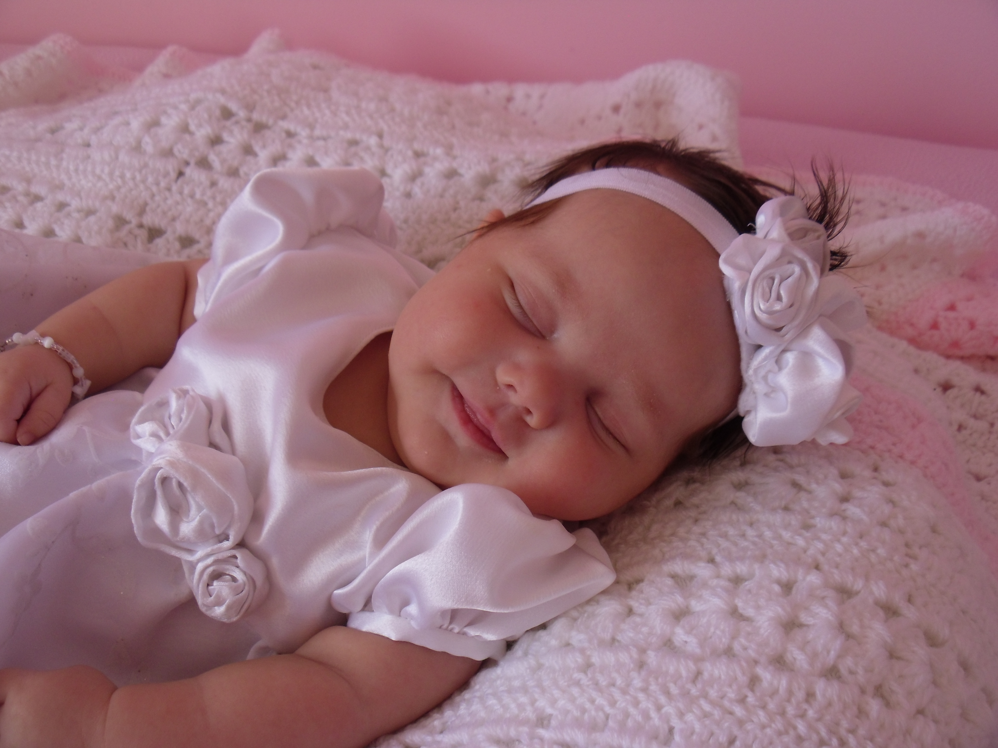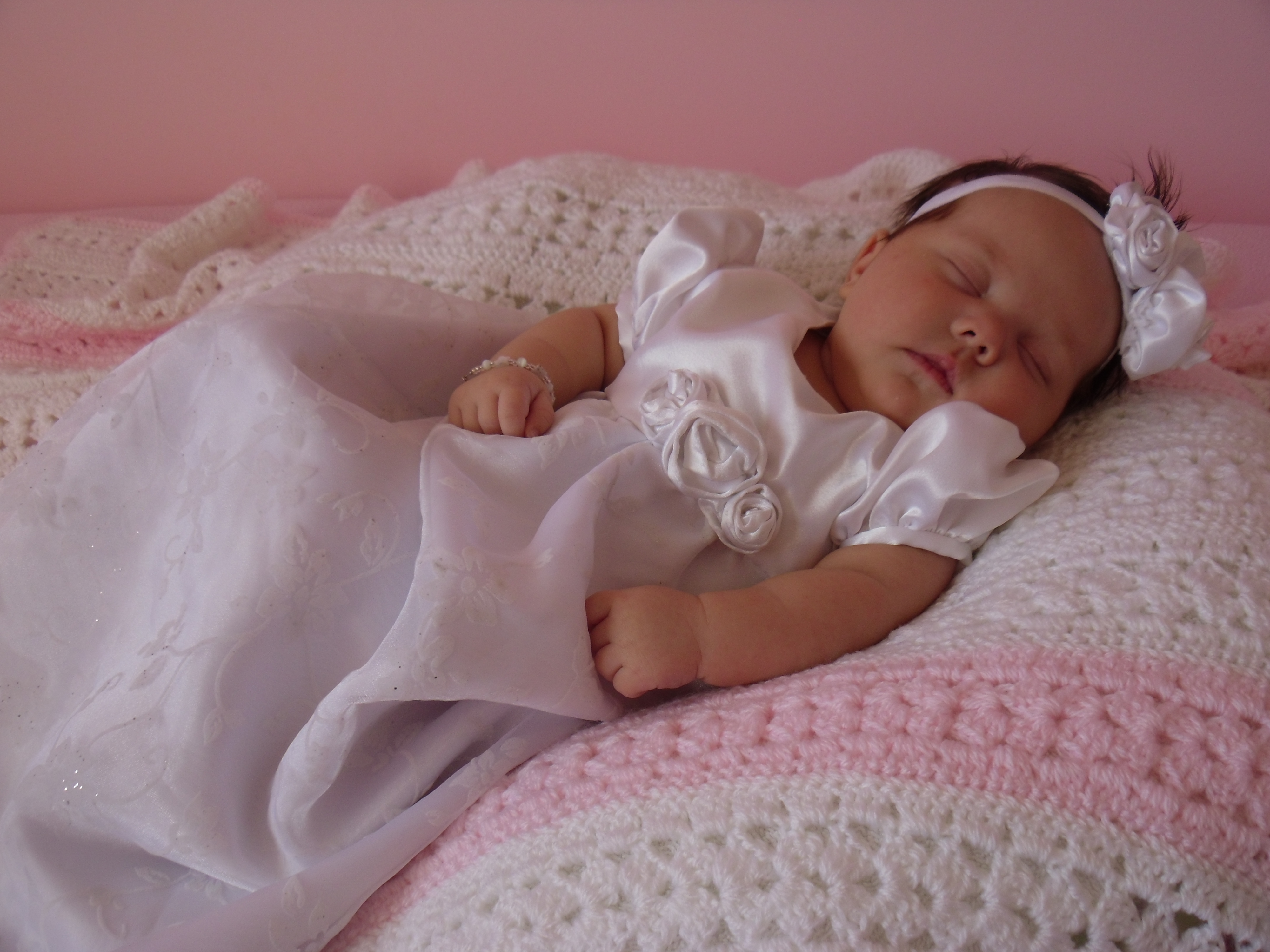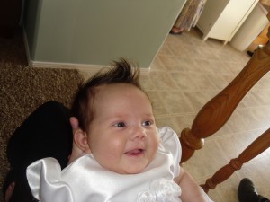 I few weeks before Sariah was born, I made her blessing dress. Luckily it fit! I think if we would have waited another month to bless her I would have had to let out the sleeves. She has some chunky arms! She looked beautiful in the dress and headband!