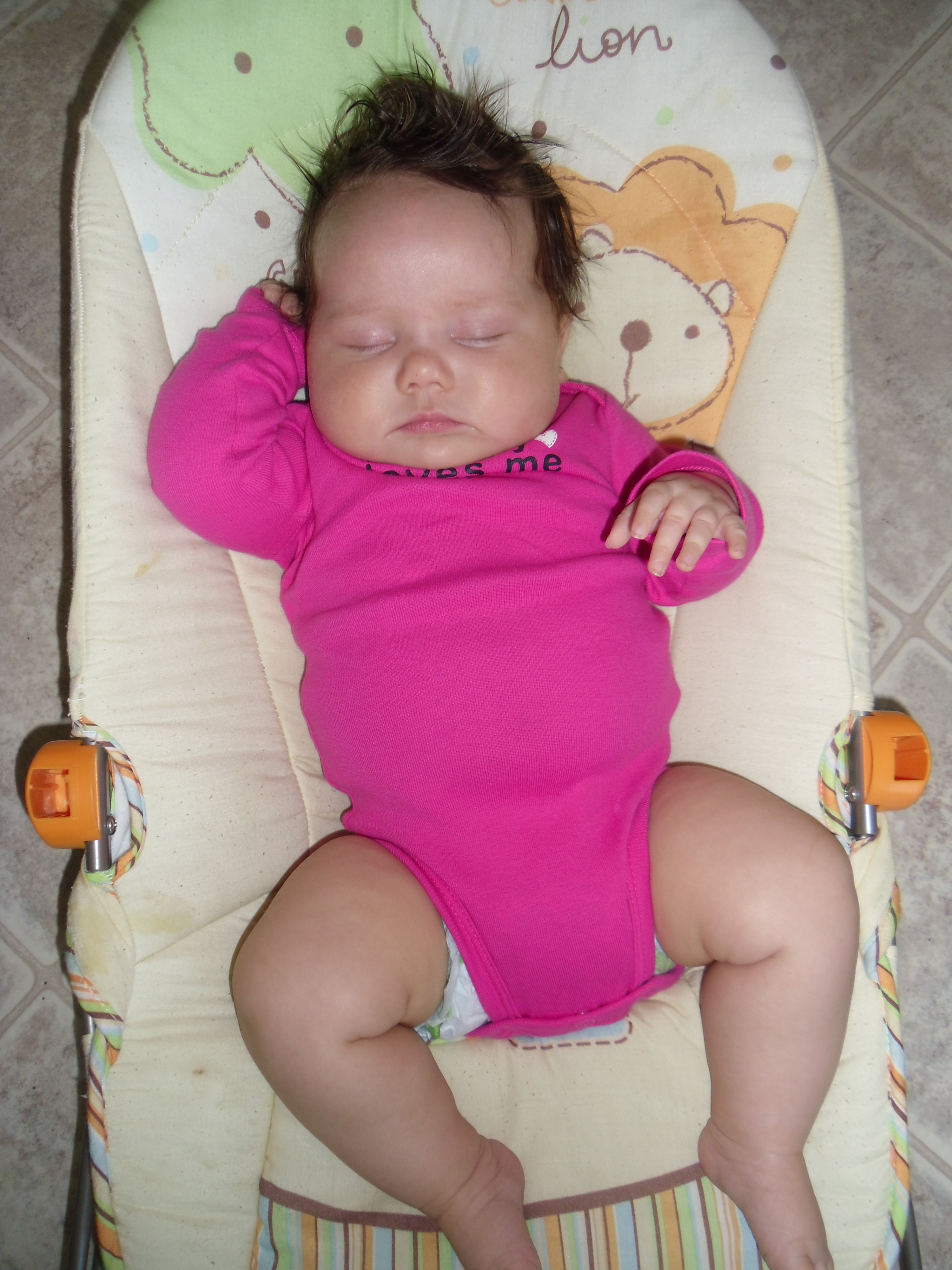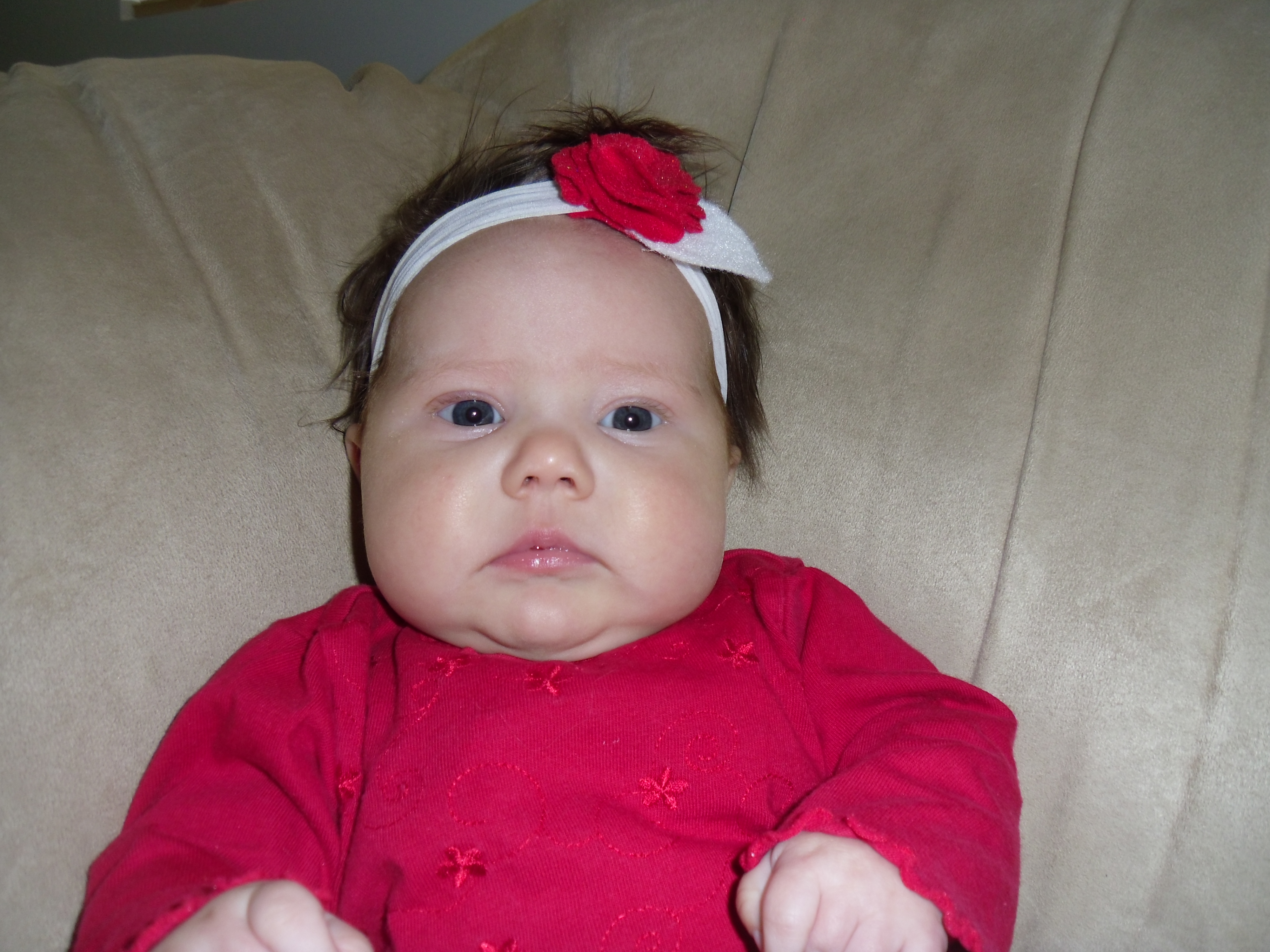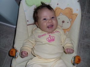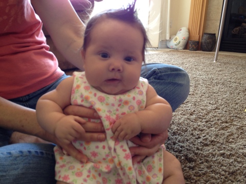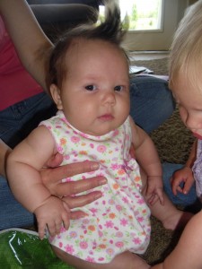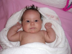 Oh my goodness! We can’t get enough of this little girl! She has wrapped herself around our hearts! Sariah is such a sweetheart. Her smile just melts your heart every time you see it. And don’t get me started about her very kissable chubby cheeks! We all take our turns kissing them! Vanessa and Owen especially love to kiss them! She is such a patient baby. She is very tolerable with Vanessa and Owen. She lets them hold and tickle her without too much complaint. She is getting stronger everyday. She likes to sit up with help and loves to look around. She is starting to reach out for things and loves to grab her clothes and bring them toward her mouth. She is adding daily to her rolls on her body. She is just so darn cute with all that chunkiness! She is our best sleeper yet! She started sleeping through the night on April 29th and has been pretty consistent since! We put her to bed around 8:30 pm and she will usually sleep until 5:00 am. That’s 10 hours! I sure can’t complain about that! She is getting so close to laughing. She grunts and makes noises when we tickle her but it is not quite a full laugh yet. Hopefully it will be soon! I’m pretty sure it will be the cutest thing! She enjoys taking baths and is starting to kick and slash in excitement. It is so fun to see her start to interact with us! Her hair is uncontrollable! It sticks up no matter what I try to do and it is getting longer each day! We still don’t know what color her eyes are yet. Some days they are quite blue while other days they are more hazel. It will be fun to see what color they turn out to be. We love her so much and enjoy having her in our family! Happy 3 Months Sariah!