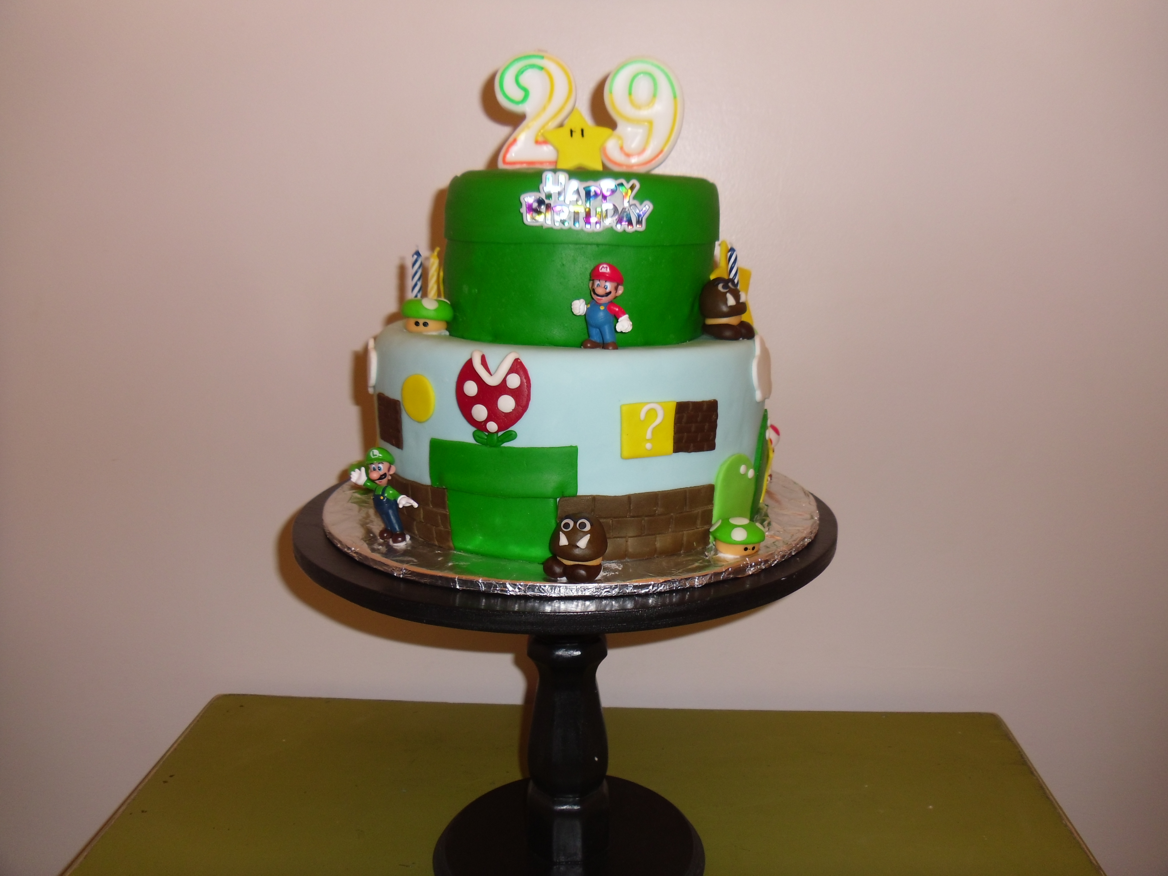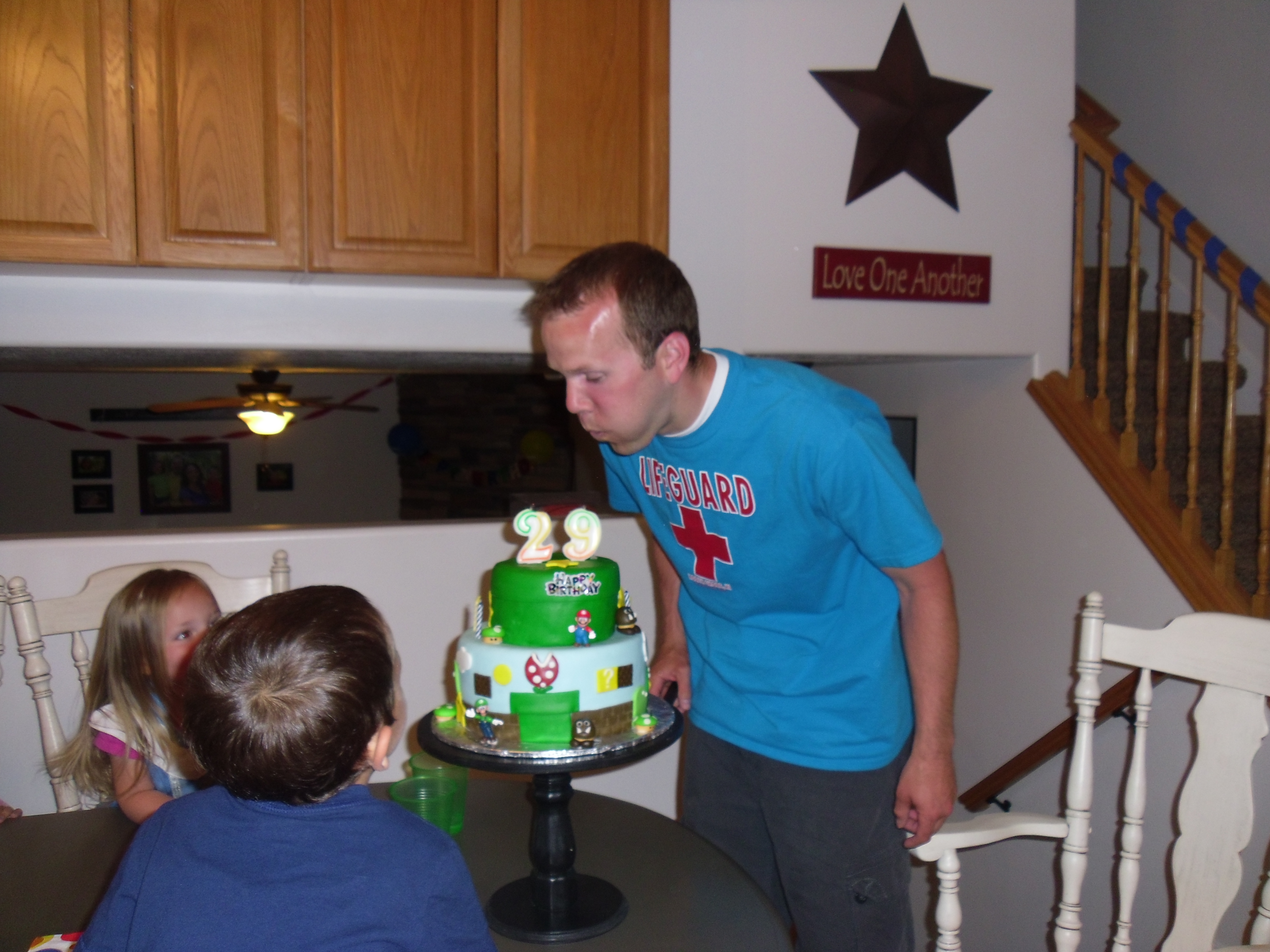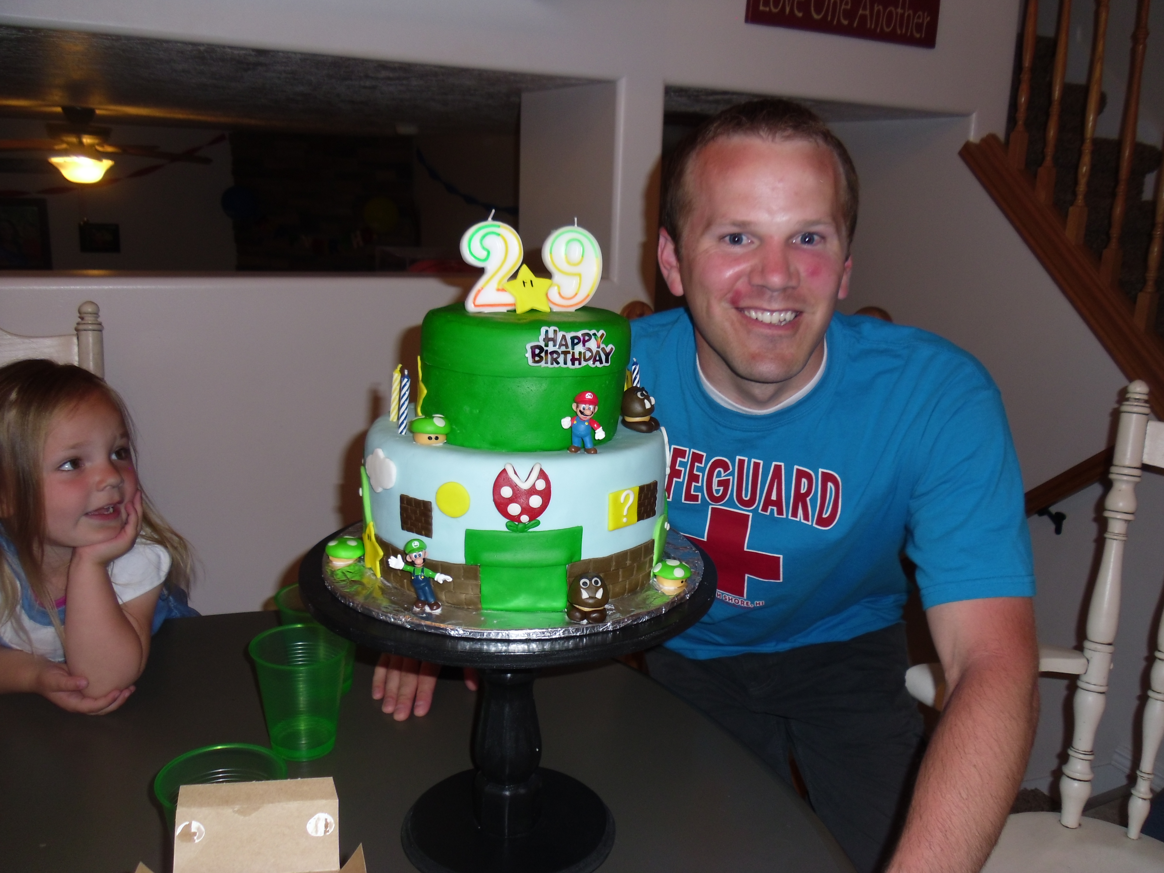 Happy 29th Birthday to my incredible husband, Mark! He had quite the birthday! He actually spent most of the day finishing installing the sprinklers. Our grass was dying so it needed to be done. After finishing, we celebrated by making homemade pizzas. He requested my famous stuff crust chicken bacon ranch and the classic pepperoni pizzas. His family was able to come over and help us celebrate! I actually had some time to make him a super cool and fun cake. Mark really enjoys playing Nintendo so I made him a Super Mario Bros. cake! It turned out AWESOME and he LOVED it! The kids sure loved it too! They put the finishing touches on the cake which consisted of little Mario and Luigi footprints around the top of the cake. They couldn’t resist playing with the little toys!