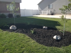 So we just keep staying busy! We got some free dirt from a family we knew when we lived in our previous house. So, we decided that we should start on building an island in our front yard. I got the tools out while Mark was at home and started cutting the grass. It was much harder than I thought it was going to be, but I got some help from some of my friends in our neighborhood. With their help, we were able to get all the grass pulled out and the dirt put in it before Mark got home from work! It was AWESOME and I am so appreciative for their help. Next came laying the weed cloth, planting flowers, trees, and bushes, and putting in the mulch. We also added 3 decorative rocks to it. It took a little over a week to finish the project but we LOVE it! It adds so much curb appeal to our house and makes our yard look great!