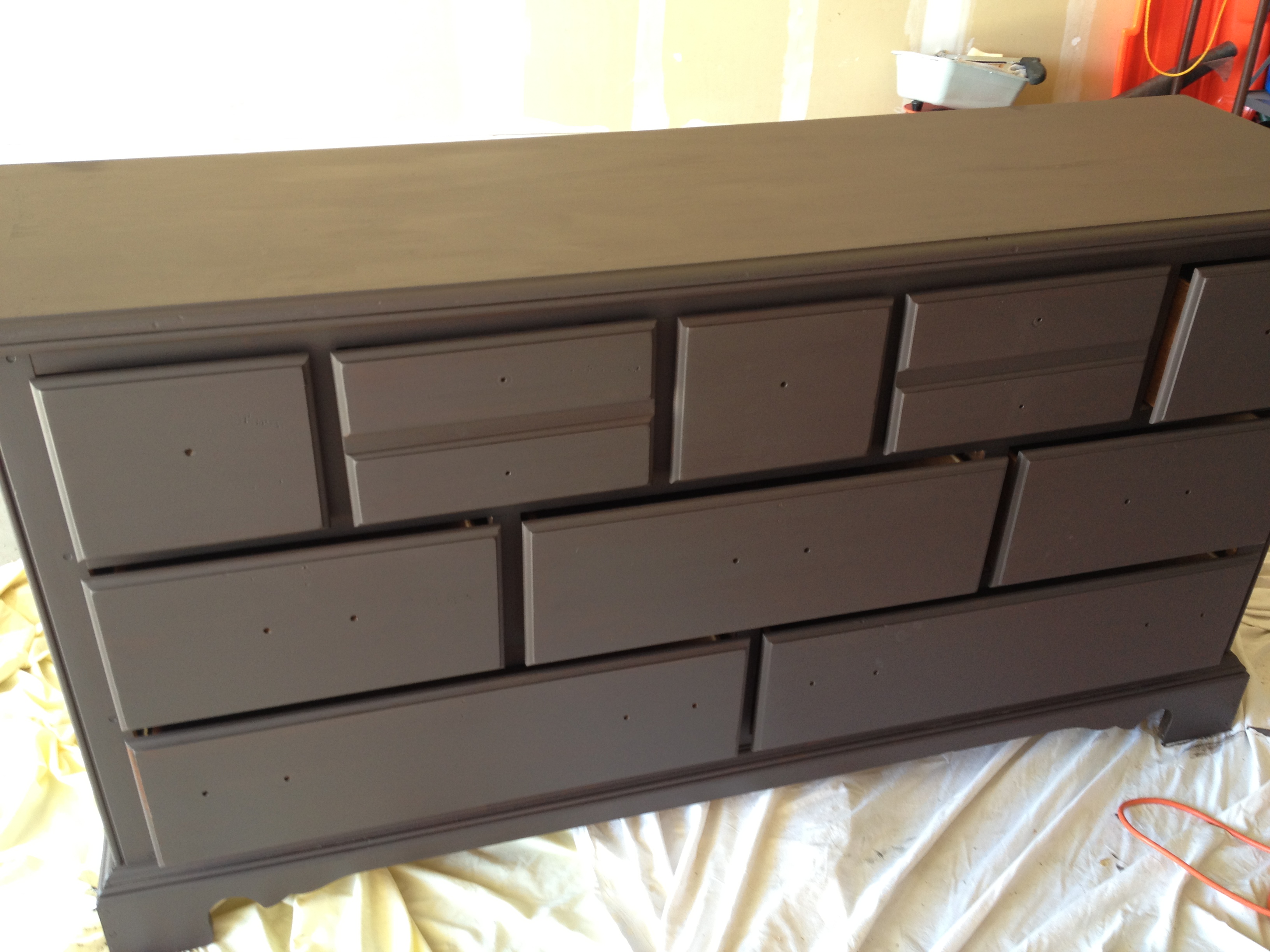 If painting the walls was not enough, I repainted our furniture to match. Since our marriage, we have had mismatched bedroom furniture and it was time to make it too good. We have been wanting a long dresser with lots of drawers so we have been searching ksl.com for a good deal. About a month ago, we found one and we snatched it up! So now we had our dresser and it was time to get to refinishing it. I was able to use some free paint I scored from the Ace Hardware promo and some oops paint I found at Home Depot for 6.00 (gallon sized!) to paint both dressers, an end table and mirror!