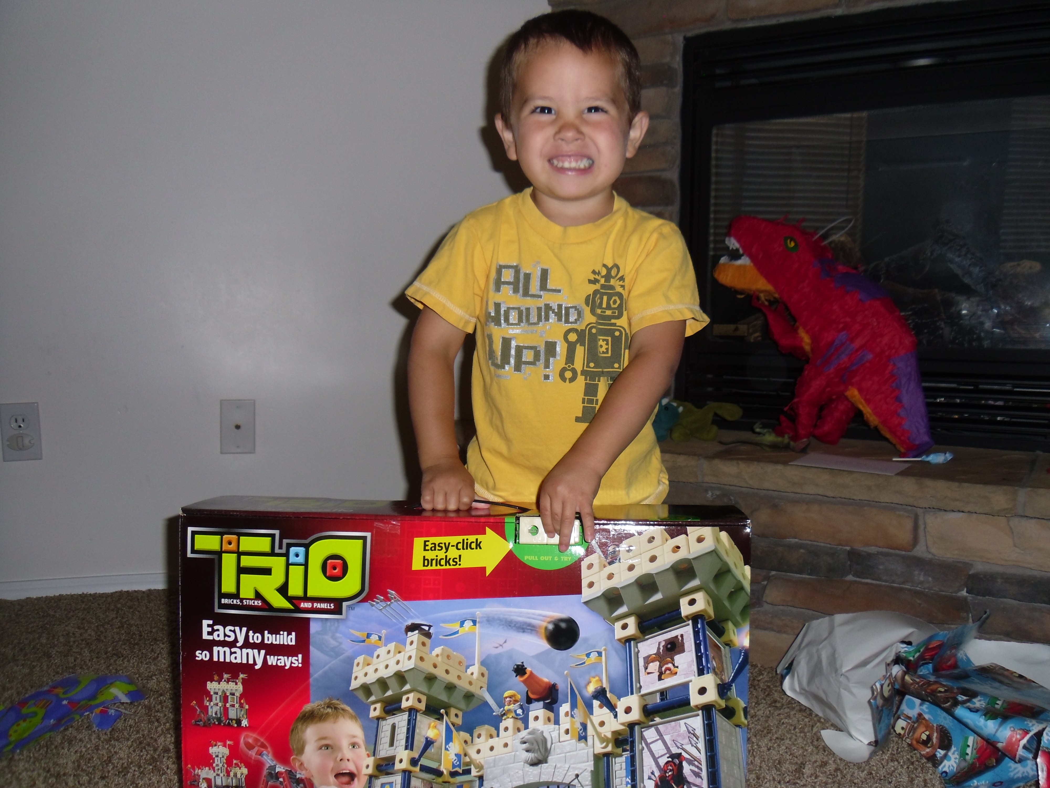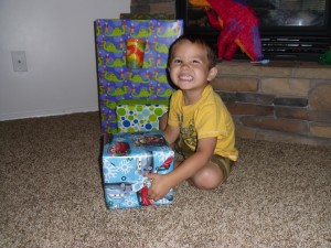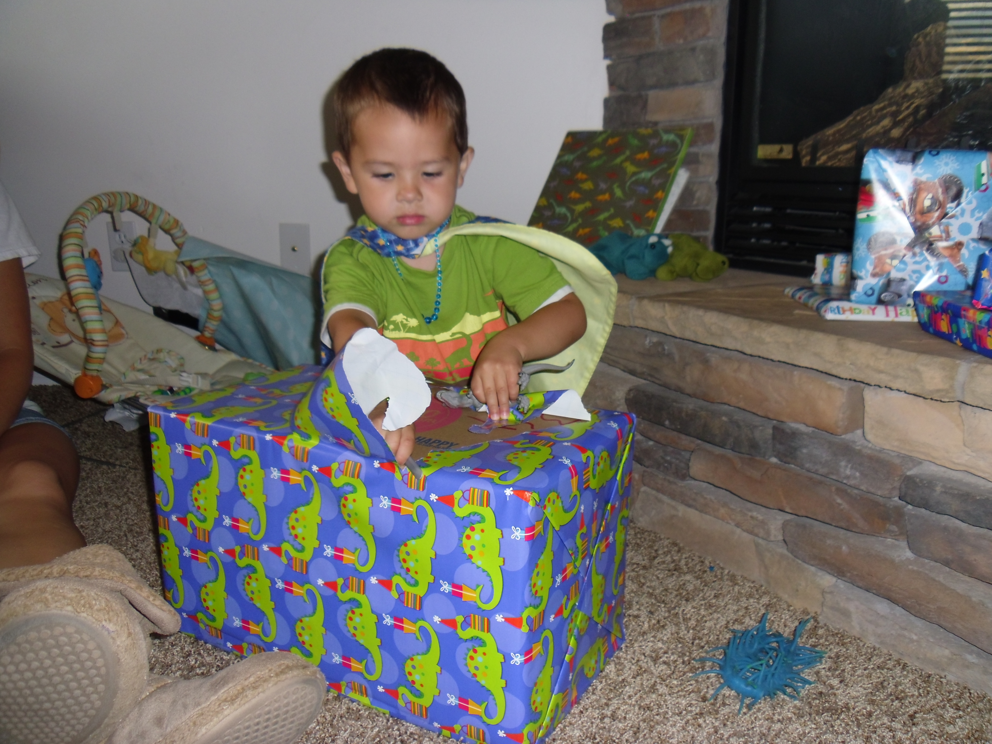 Present time came and he couldn’t have been more excited! All he wanted to do was unwrap the paper. Every time something came in a box he would look at it and say “Oh a box!” and then move on to the next present! We had to make him stop to open the boxes. He got some dinosaurs, a dinosaur bingo game, coloring books, books, light sabers, a tool set, Dino flip flops, and clothes.