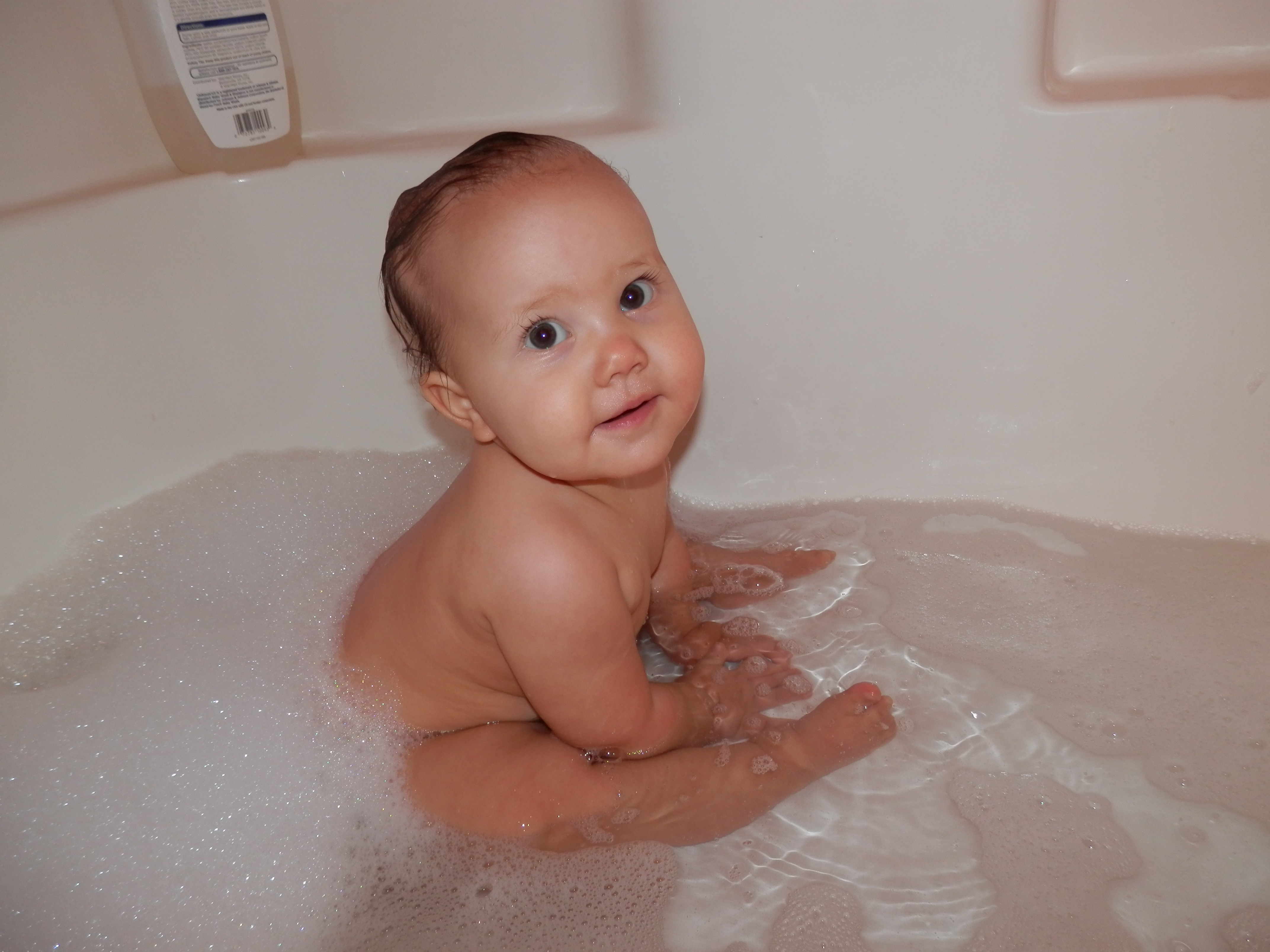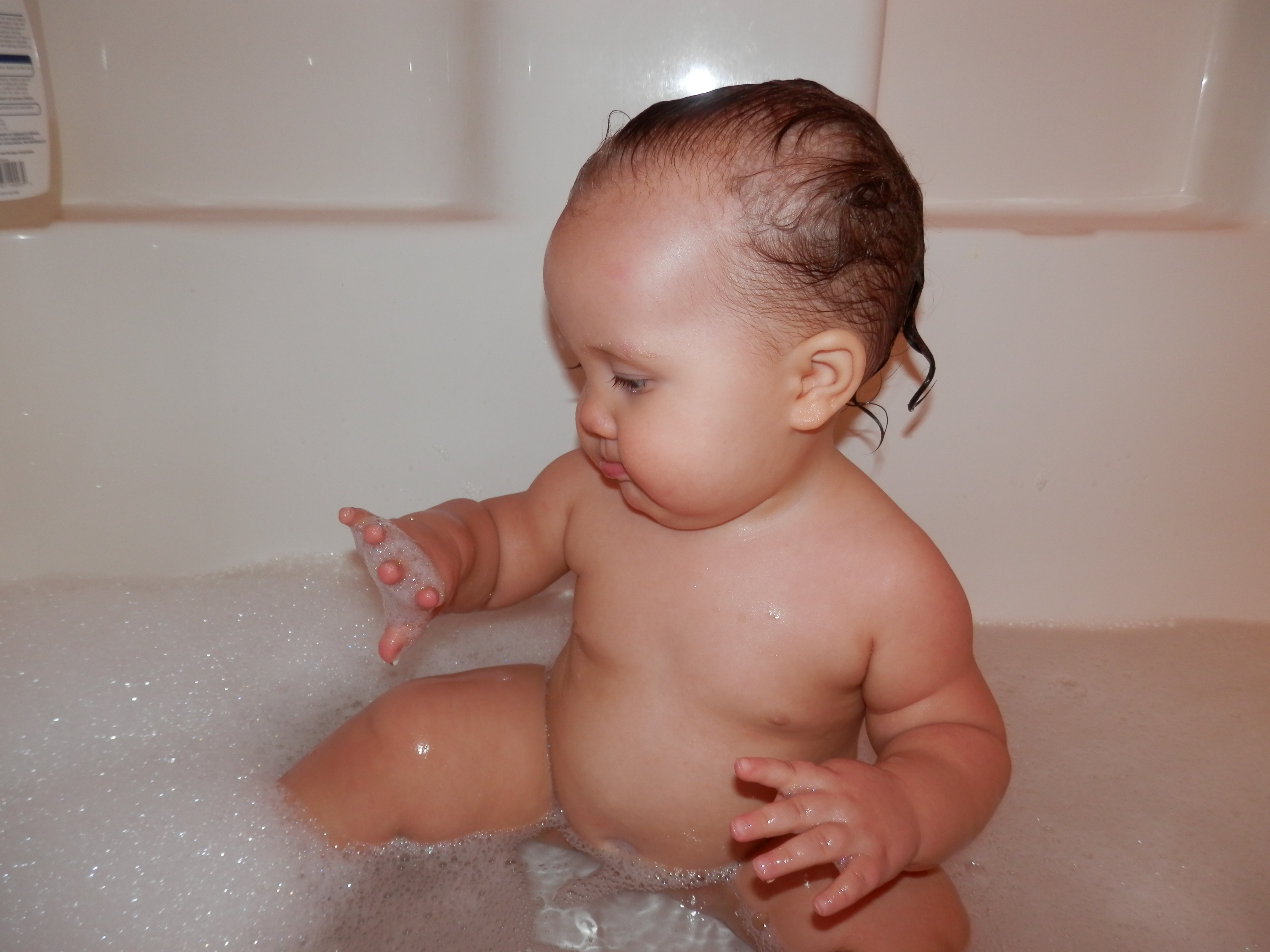 She also LOVES bath time. She gets so excited when we turn on the water. She starts to bounce up and down and giggle! It is the cutest thing! It’s just one of the things that I adore about her! She just loves to play in the water and gets pretty mad when it is time to get out. She discovered bubbles the other day when I put bubble bath in. She was amazed and just kept picking them up and trying to eat them. Too cute!