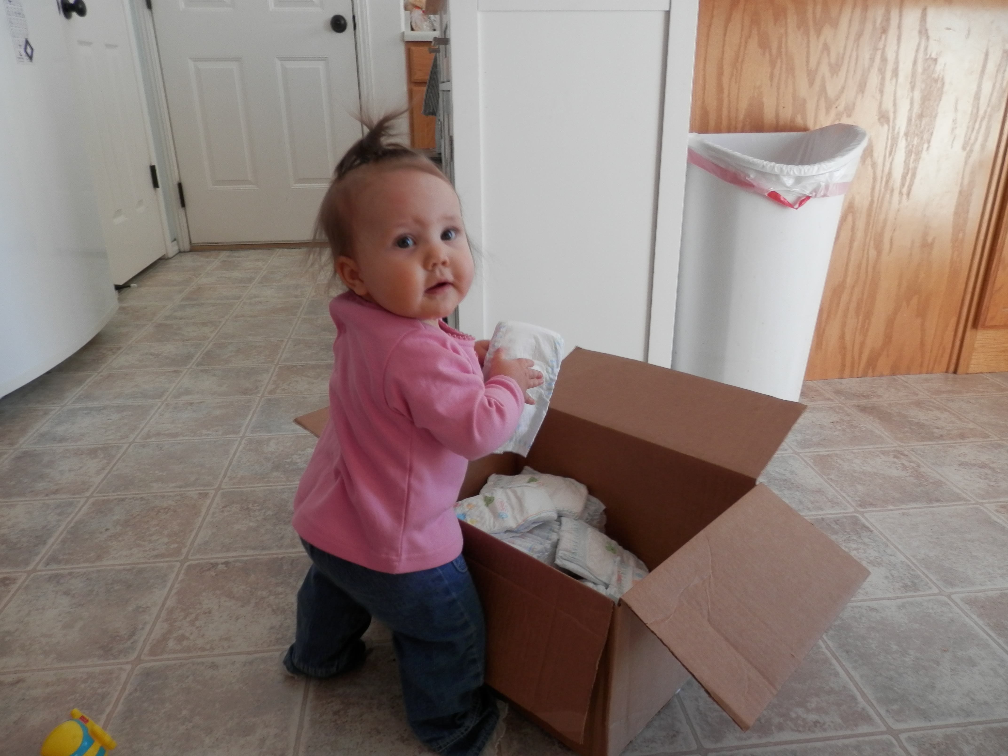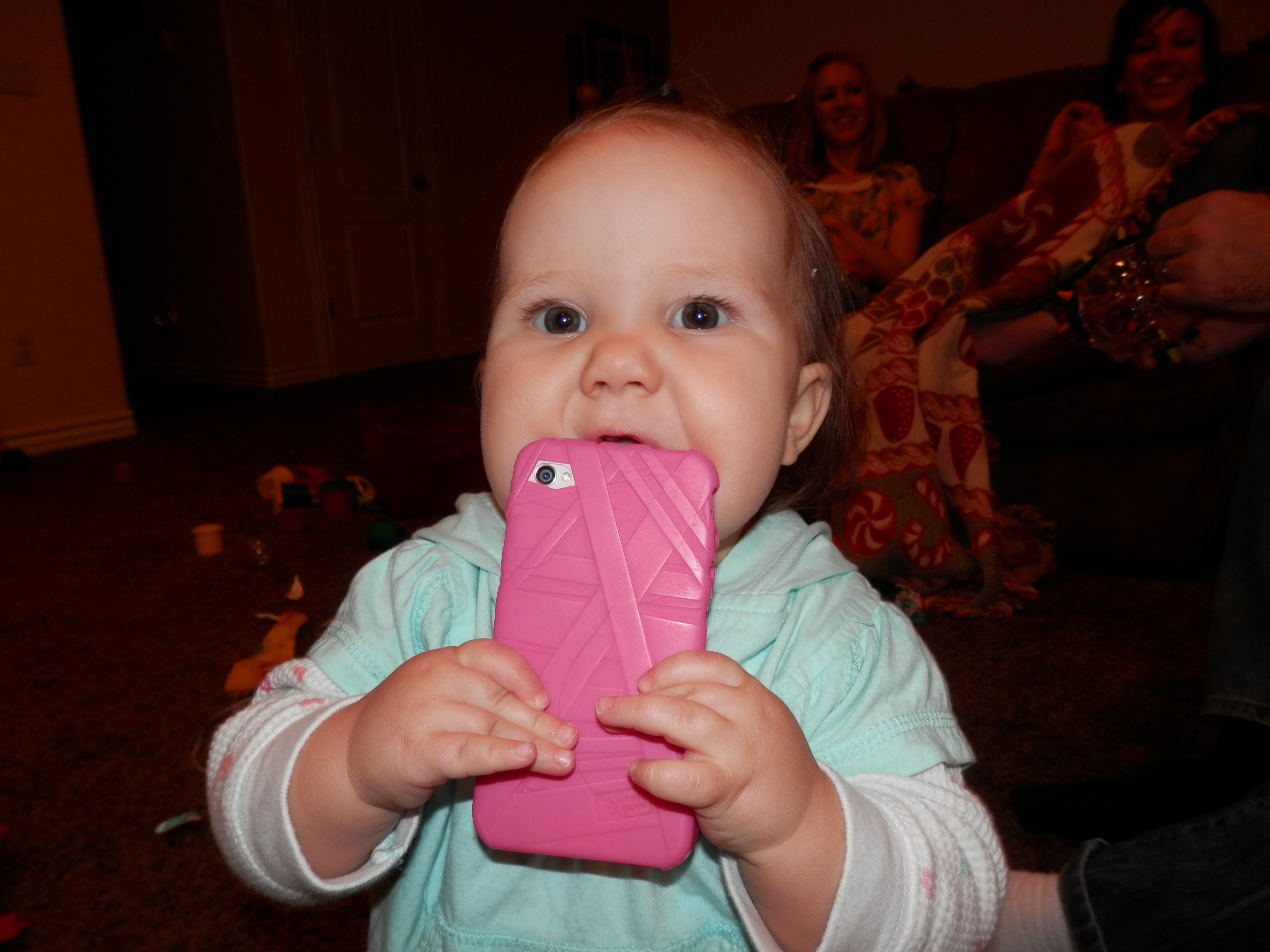 She loves playing with her big brother and sister. Now that she is getting older she can keep up with them a bit more. She also loves phones and remotes. She loves to push buttons and whenever she hears a phone ring she stops and holds her hand up to her ear and says “Ahh, Ahh.” She is one smart cookie!