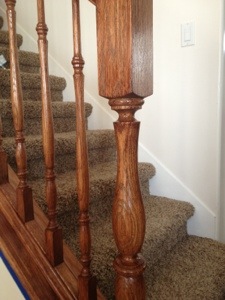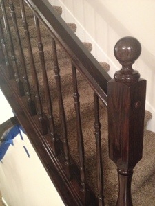 Now, this was a PROCESS but it was SO worth it!!! Since moving in, I have been itching to redo our dated blonde oak banisters. I finally scratched the itch and got to working on it. I researched online on what would be the best way to do it and got some ideas. I learned of a product called PolyShades which allows you to stain over top of the existing top coat without sanding. My good friend RoShawn had a can of it and let me use it. I cleaned the banisters and got to work on staining it.