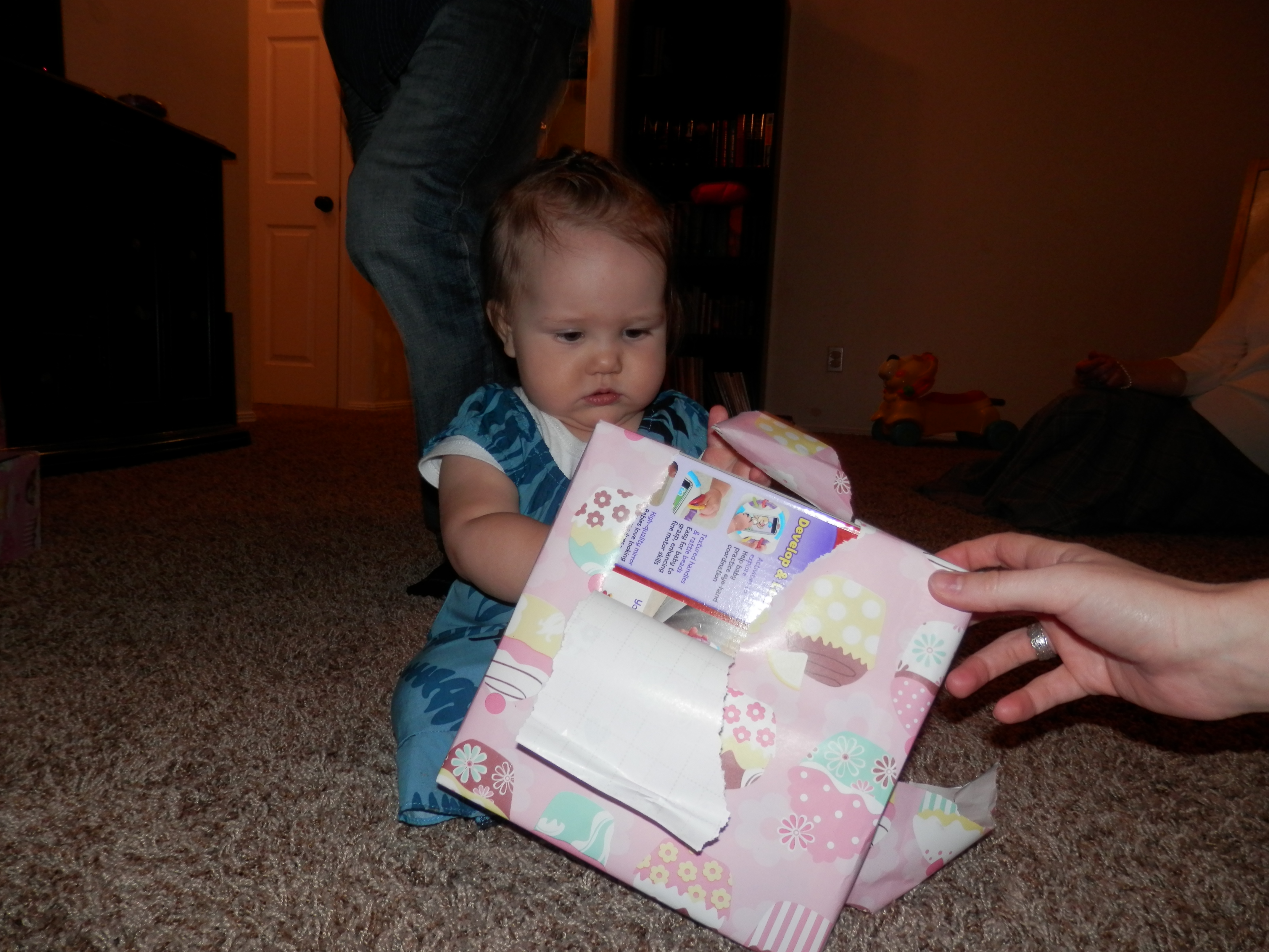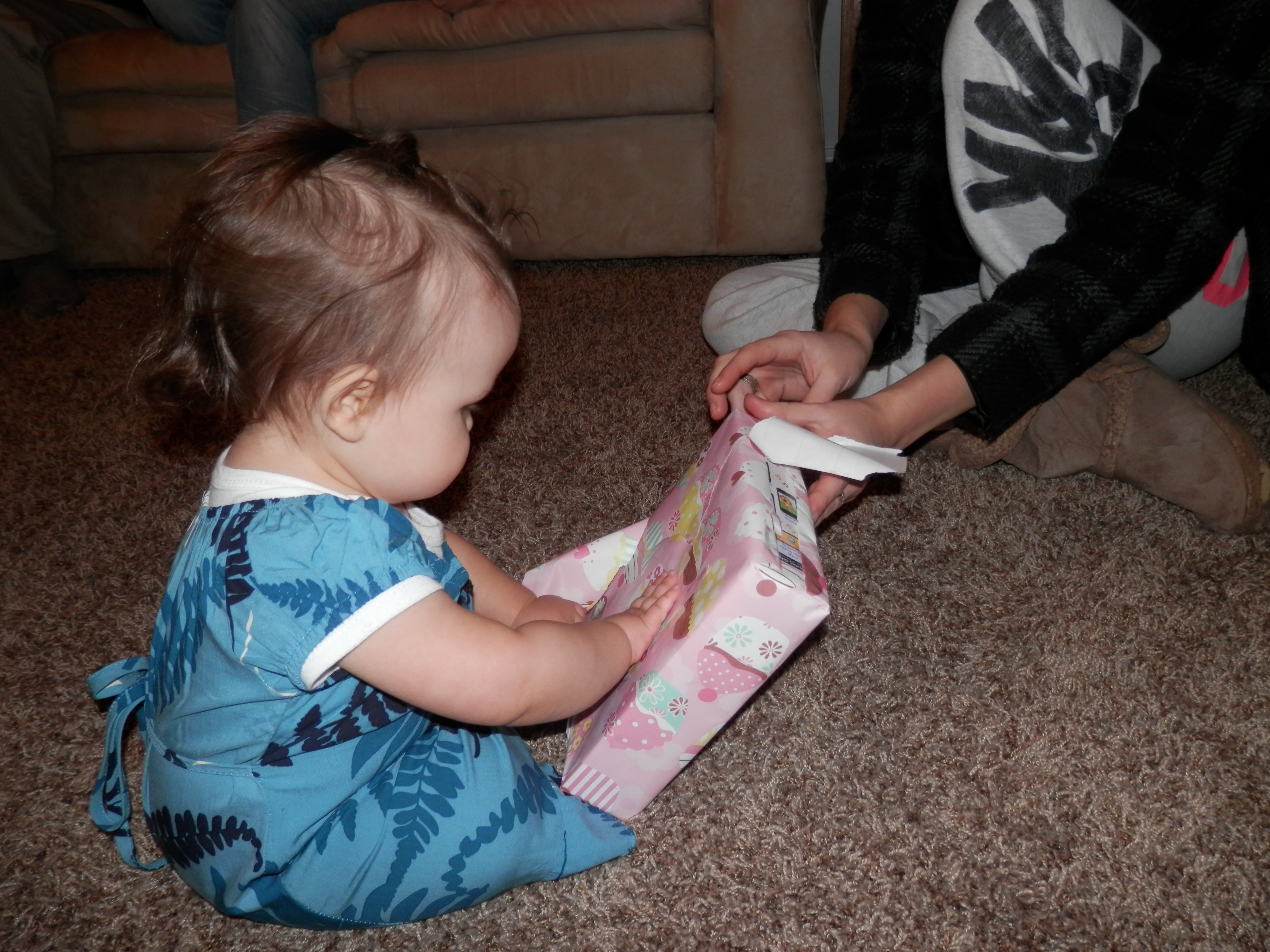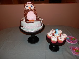 We still were able to celebrate on her birthday , February 10th, with the Sorensen family. Her birthday theme was Owls. I made her a 3D Owl cake that turned out so cute and some cupcakes. She loved opening her presents and eating the paper. She got a driving wheel with buttons, a Little People Little Mermaid set, an iPod kid cover, a sweat shirt, a Happy Birthday bear, and a bee pillow pet. The best part about her birthday was being sung to and eating ice cream. She LOVES ice cream!