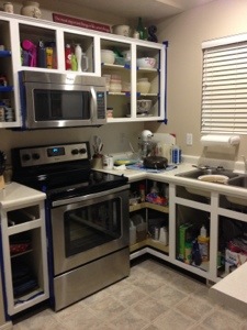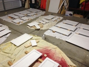Once the cabinets were placed, I began taking off all the doors and drawers. When done, I was a bit overwhelmed when I looked at the huge pile of things that would need to be painted. I didn’t dwell too much on that thought and got to work every spare moment I got. Which usually was during nap times or when Mark was home from work. The whole cabinet transformation took me just over a week to finish.