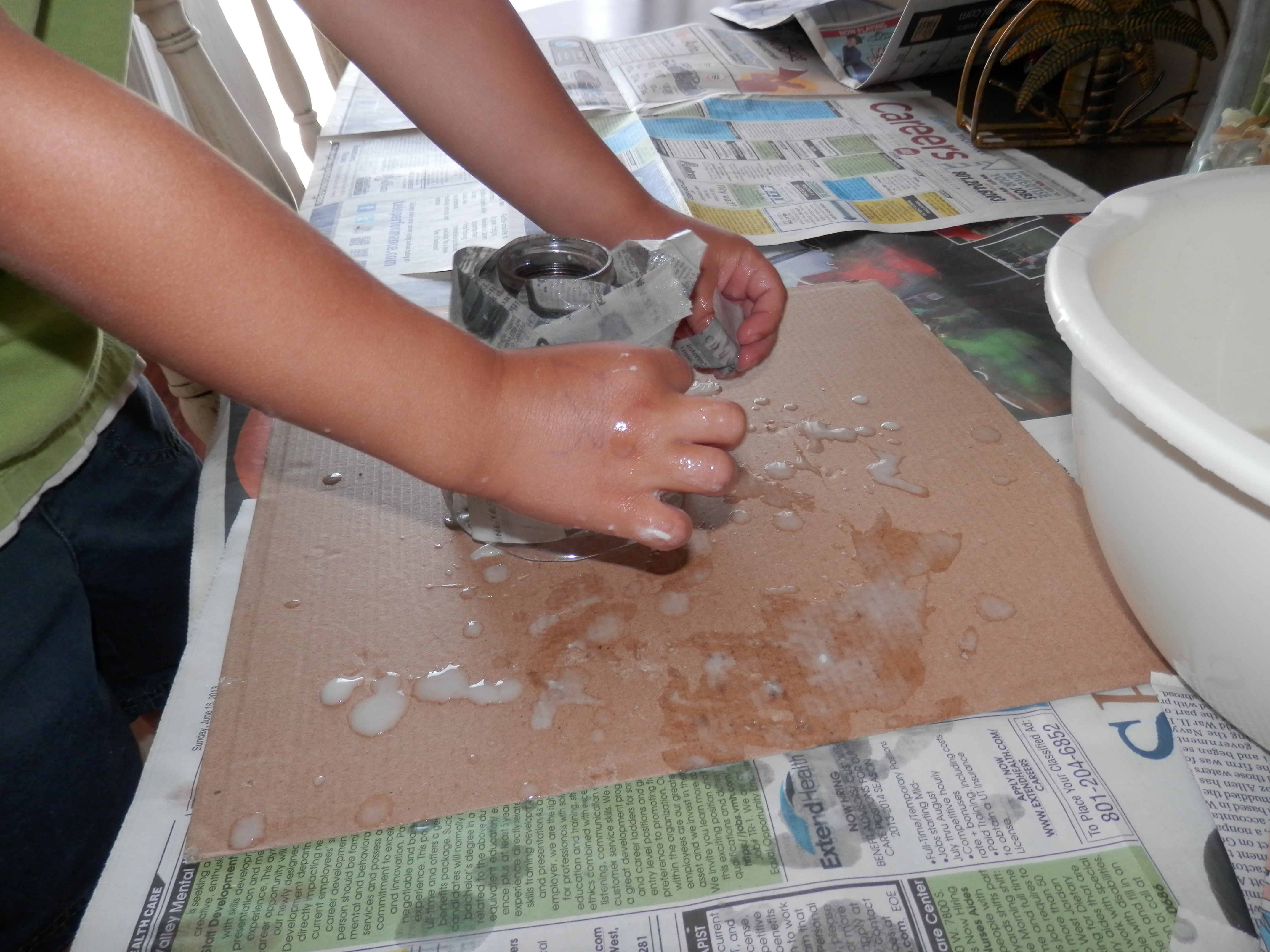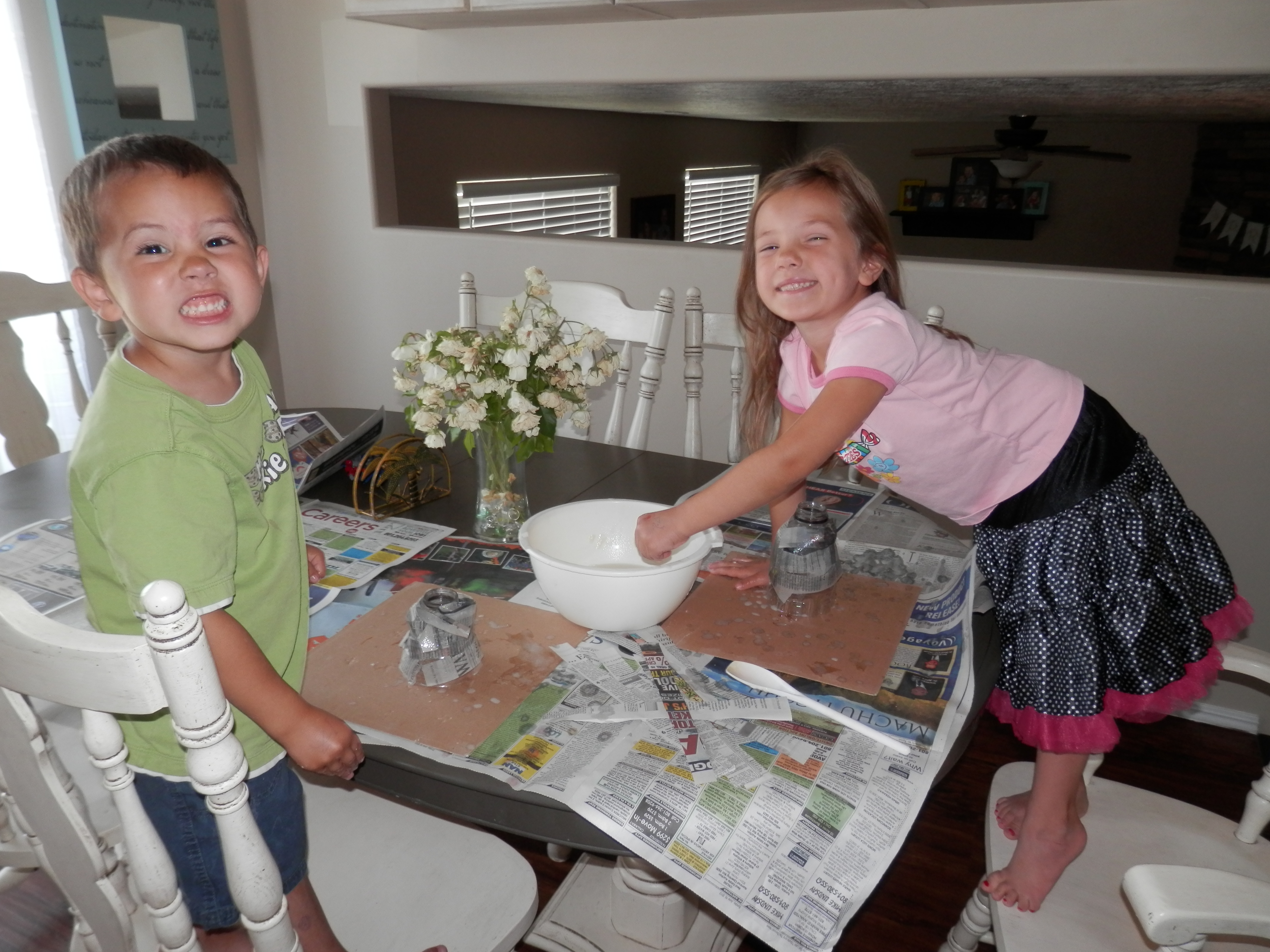 A fun science project that we did was make a paper mâché volcano. We had two Gatorade bottles and we cut strips of newspaper and dipped them in the “glue” and them wrapped them around the bottle until they were completely covered which meant the kids used up all the strips. We then set them outside to dry. The next day, the kids painted their volcanos. Owens was of course green and Vanessa’s was pink. They had a lot of fun decorating them and it was a great activity to keep their little hands busy!