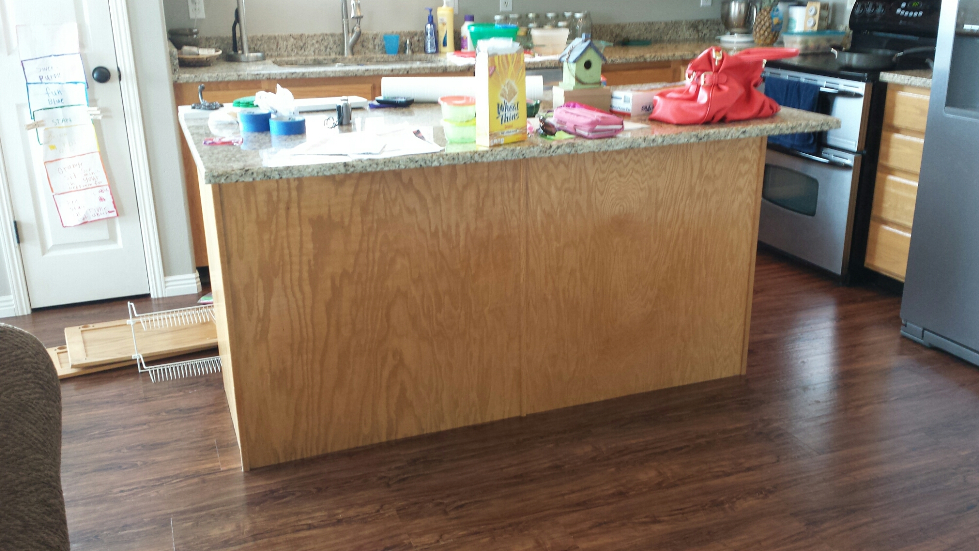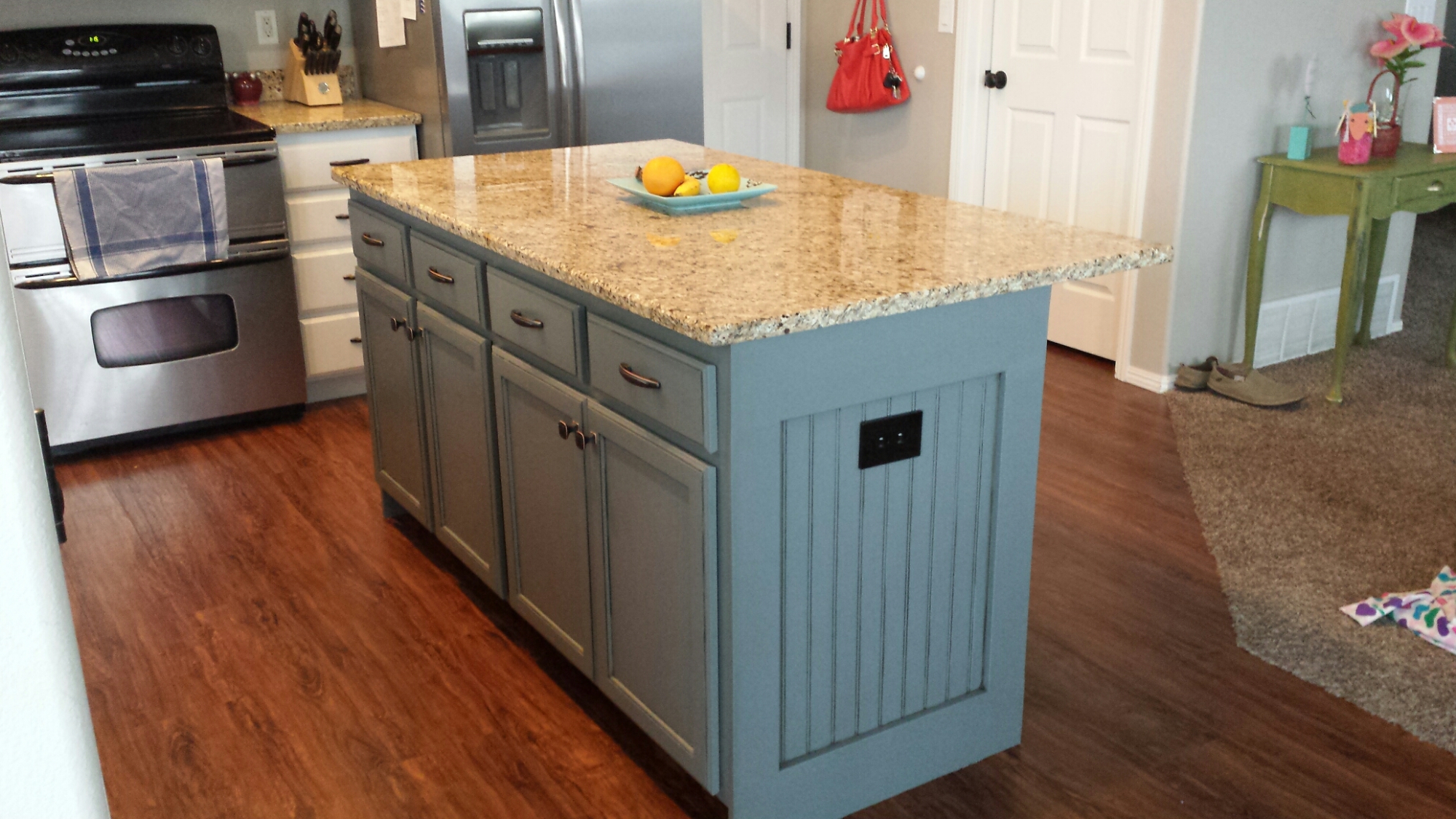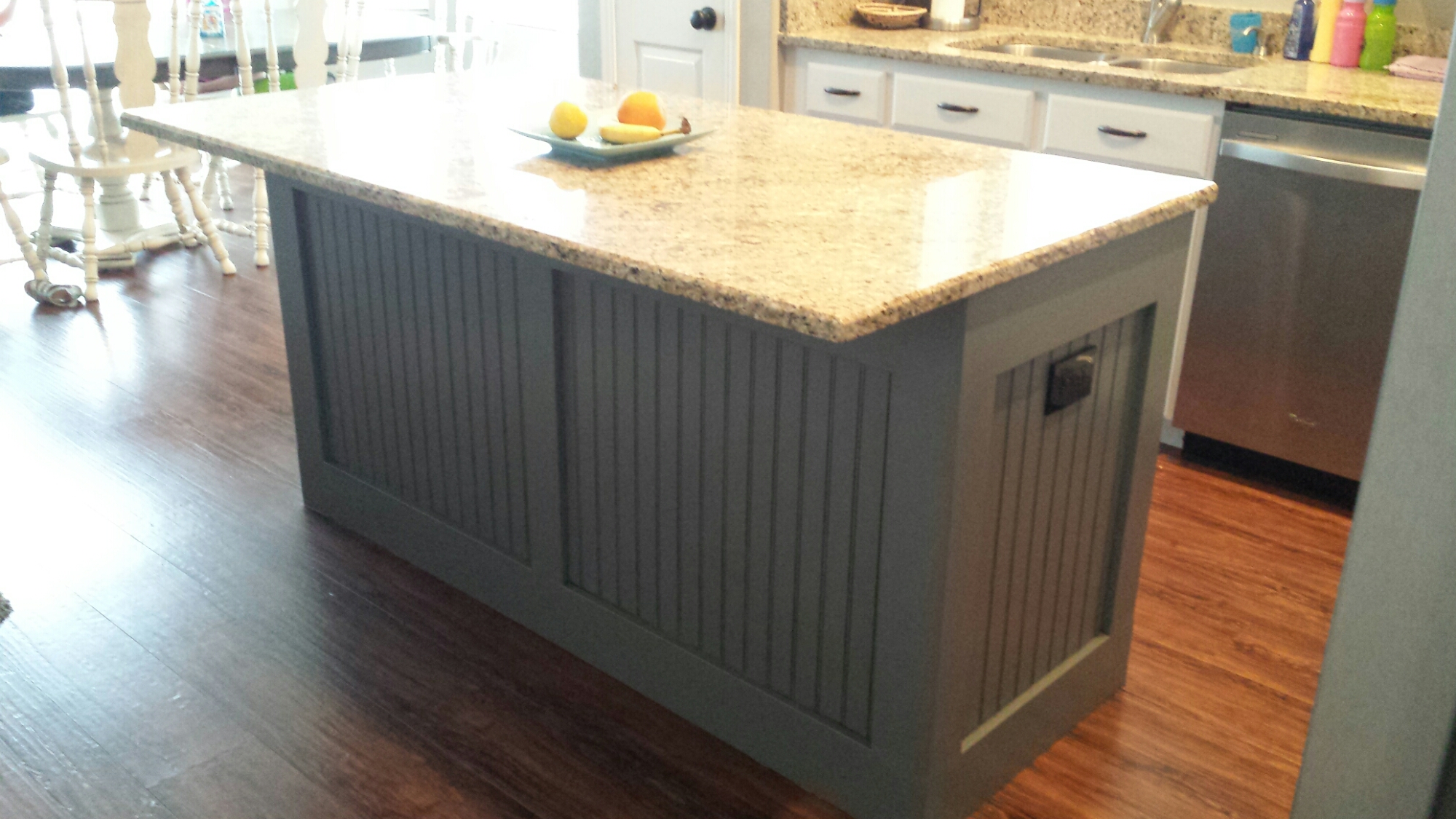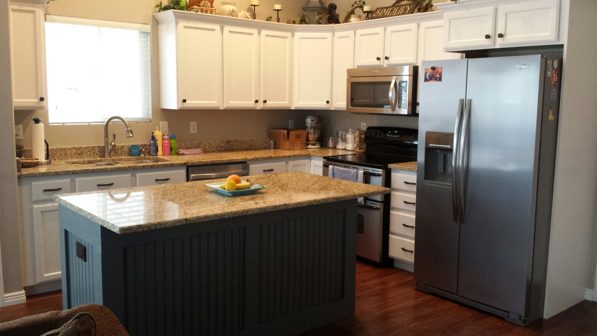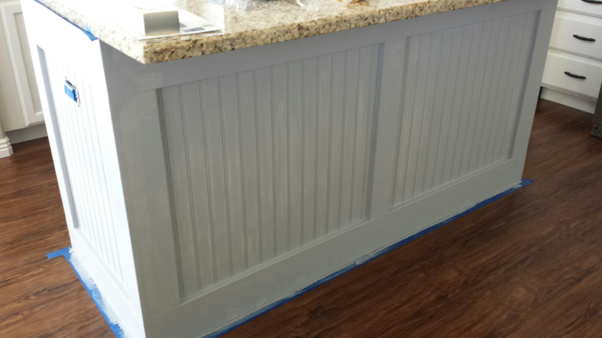 We took a few weeks off but then jumped back in to finish the island. I wanted it to be a color and it was really hard to decide. We ended up picking a charcoal blue grey. I wanted our island to be an accent piece so Mark added some board and batten trim and bead board to it. After getting that all nailed and glued on, I began the same process of priming, sanding, and painting. We had decided to add glaze to the island for that additional pop. It took us about a month to get everything all done in the kitchen but it was so worth it. It turned out exactly how I imagined it and we are loving the fact that we can now relax and wait for baby number 4 to join our family!