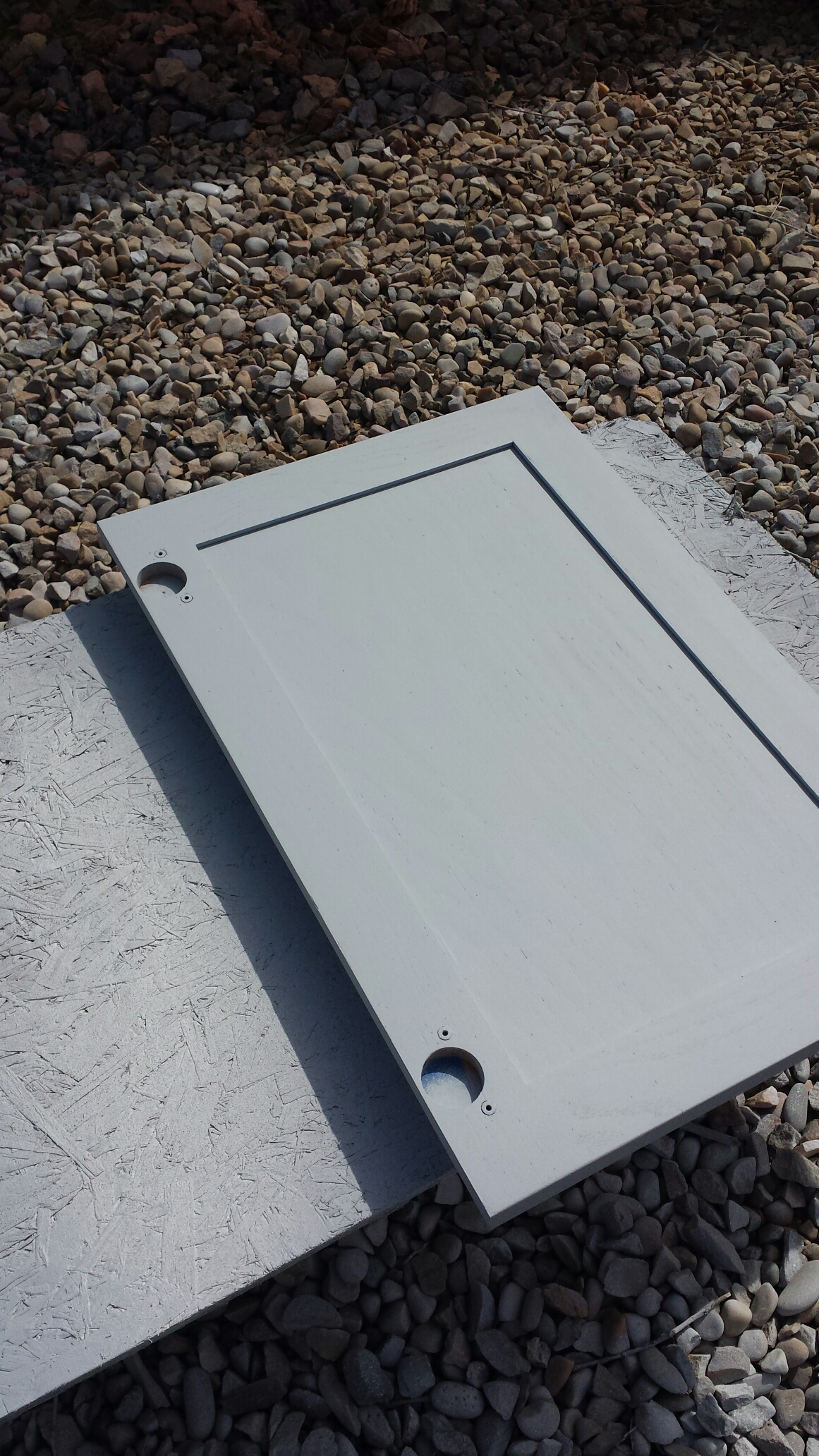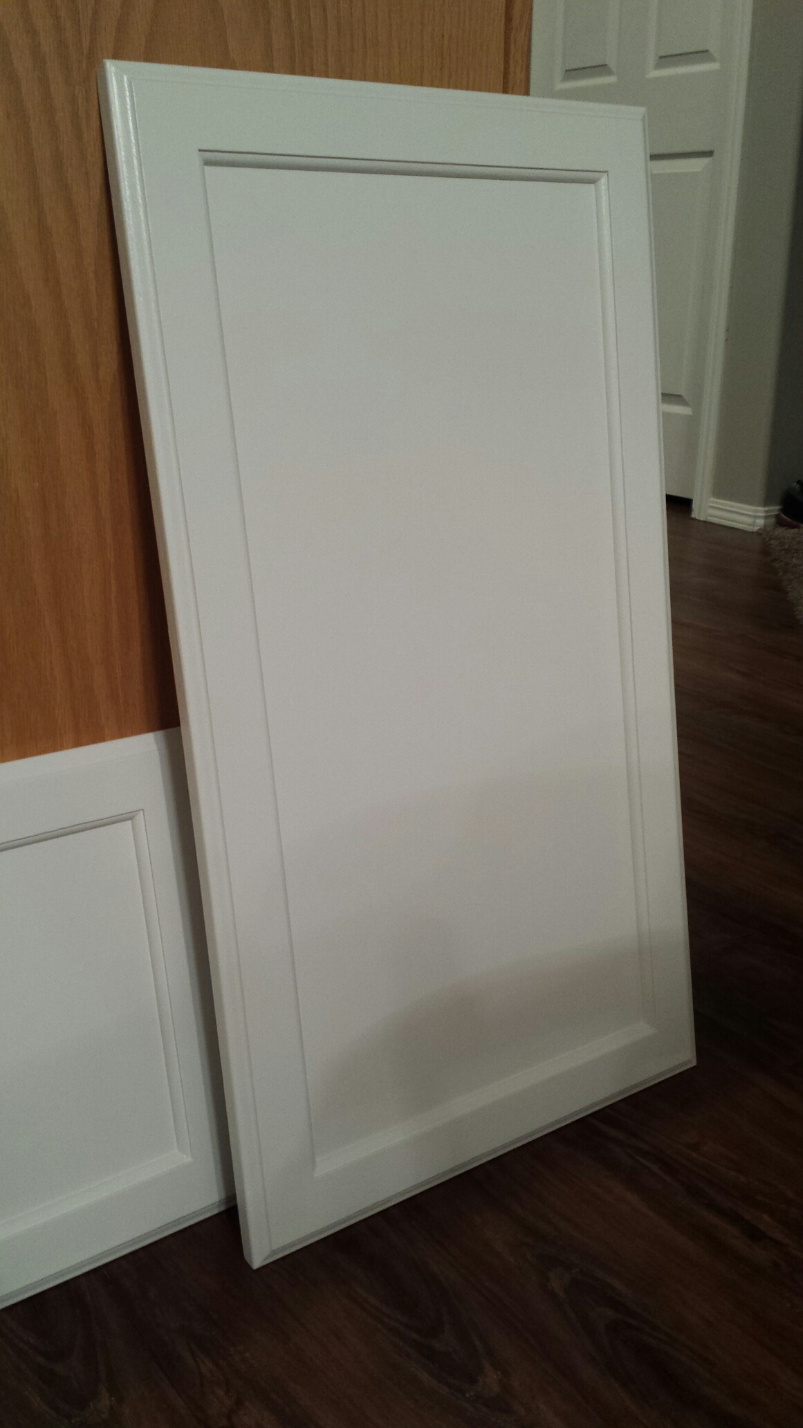 I took my time on this project because I really wanted to get a professional look. So to start out, I sanded and deglossed everything. The next step was to try and cover up as much of the oak grain as possible. I read up on how to do that and found several ideas. I chose to use spackling on the doors because it seemed to be a little easier. Well, it was a VERY long and frustrating process. By the time I was done spackling and sanding, I thought I had ruined our cabinets. Not a fun feeling to deal with! Mark calmed me down and convinced me that he thought it worked and to try and prime one of them. I took his word and primed one to see how it would look. It was like magic, the wood grain was filled and it looked flawless. I guess it was worth all that time!