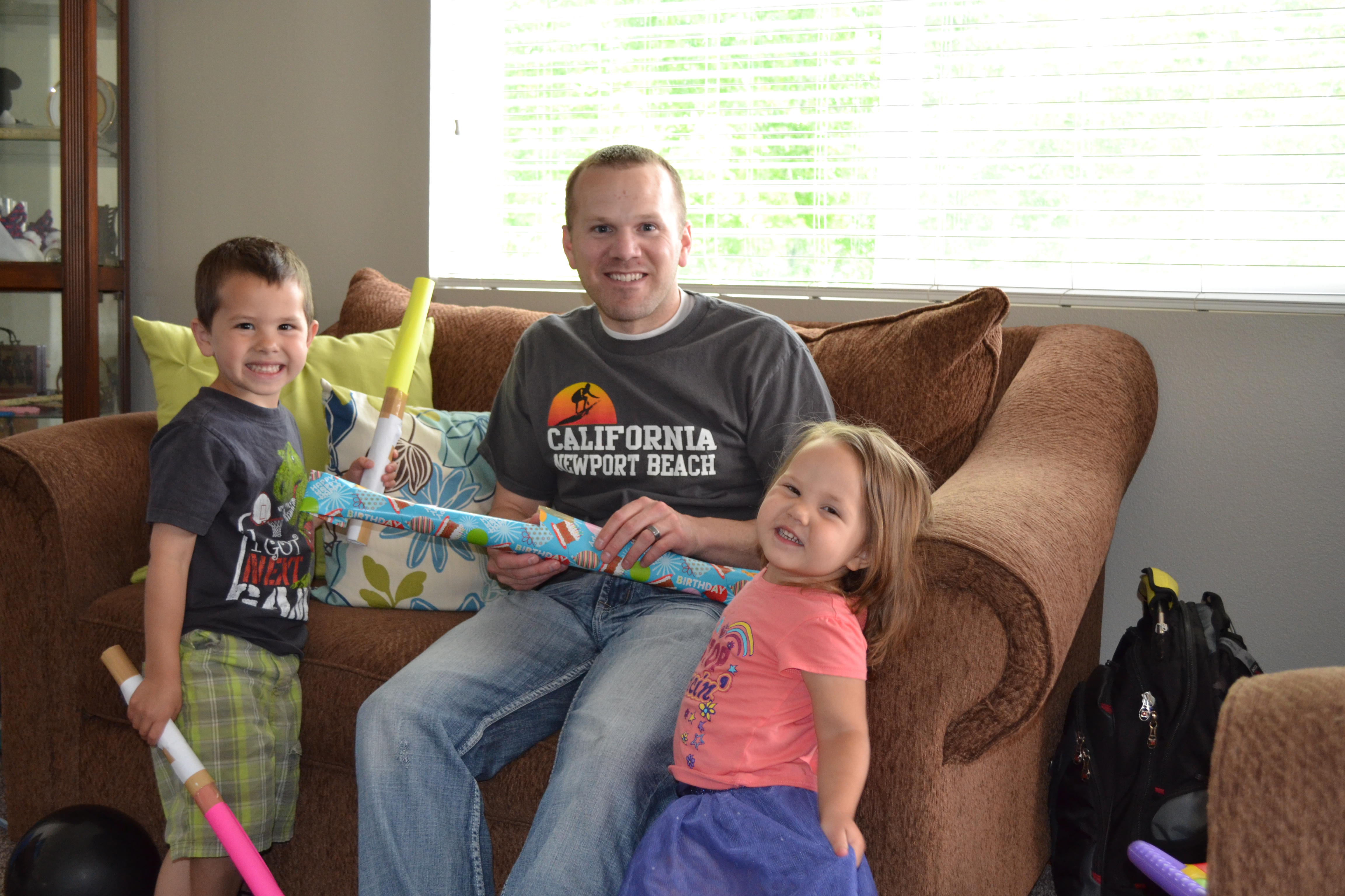 This handsome daddy turned 31 today! It has been 10 years since I met him and it has been fun to celebrate each year together since! We spent the day getting ready for his party while he was out doing a service project for the ward. He is always so willing to go and serve others even on his birthday. That is what I love about him! So while he was out, we decorated the house and the kids helped make him his cake. Owen wanted to make his dad a present so he came up with his very own creation of a light saber made from card stock and tape. He was so excited to wrap it up and give it to him so they could play!