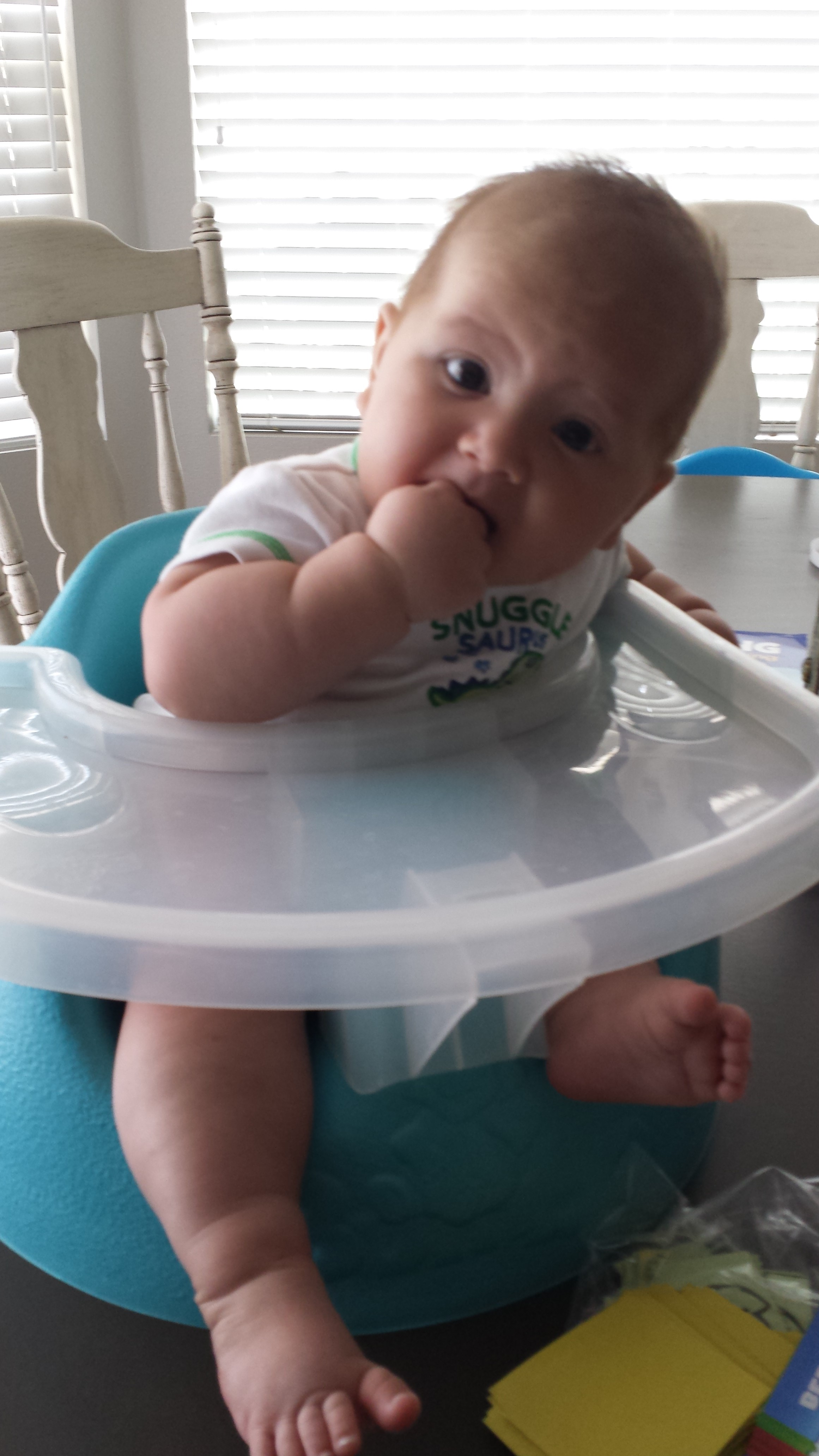 This little guy continues to grow and grow! He is just so much fun to have and is such a good baby. He sleeps really well at night now, which makes this momma so happy to get more sleep! He is learning how to laugh more. His laugh sounds more like a  higher pitched sigh. It is too cute! He has learned how to roll over from back to front and uses his legs to push himself in a circle on the floor. He definitely wants to get moving to keep up with his siblings! We love all of his chunkiness and all the rolls! He is now wearing a size 3 diaper and fits into size 6 month clothes. His brother and sisters just adore him and love making him smile and laugh. He is a momma’s boy and loves to snuggle and give mom kisses. He is such a wonderful addition to our family! We love you, Chaddy!!